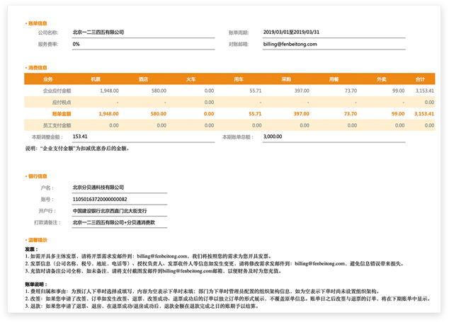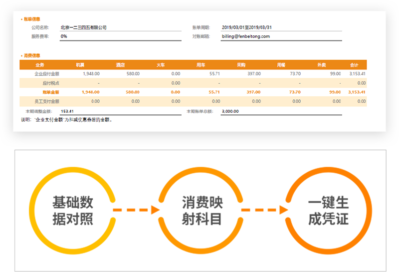 ●企业通过标准账单、定制账单,快速提取费用类别,提高财务入账效率