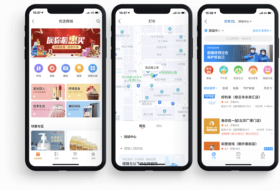 ●用车接入滴滴、首汽、神州、曹操、易到、嘀嗒出租车,一键叫车更快速的响应速度